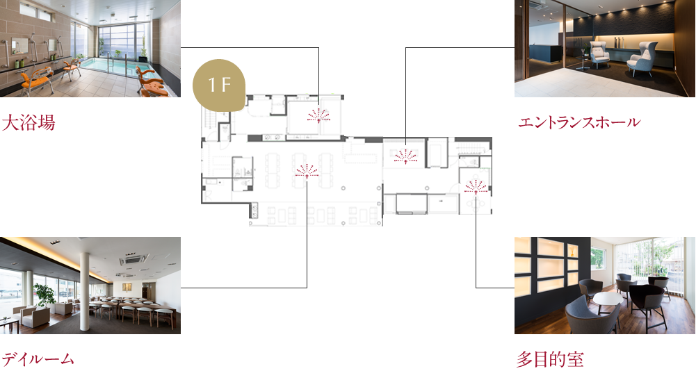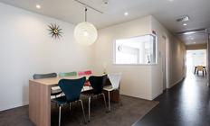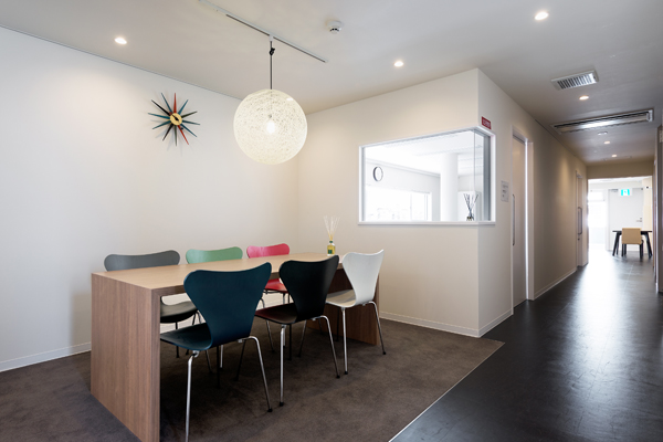 ウォールナットを基調とした広々とした木の温かみを感じて頂けるデイルーム。御利用者様同士の愉しいひとときをお過ごし頂けます。