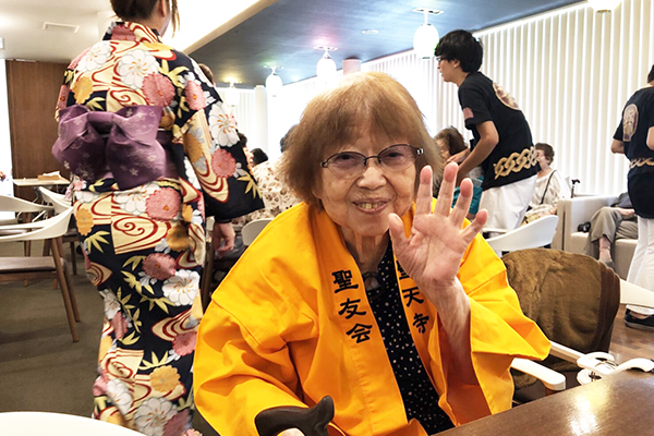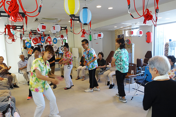 浴衣姿のスタッフと輪になり楽しく盆踊りを踊りました♪♪