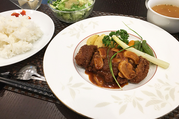 総料理長の丹原シェフによるジューシーな牛肉を何層にも重ね合わせたミルフィーユ仕立ての牛カツを堪能していただきました。