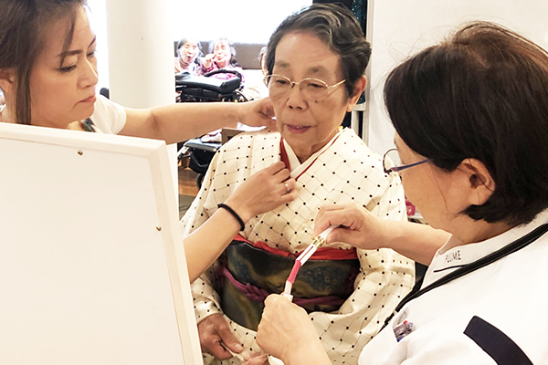 レクリエーションでは好きなお着物やドレスに着替えて頂きメイクも施した素敵なお姿で記念撮影をしました。