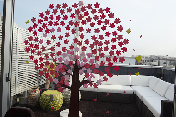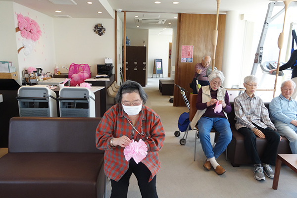 利用者様にも協力して頂きの桜の花を沢山作り飾り付けを行いました。器用な方々が沢山おられ大変感謝です。