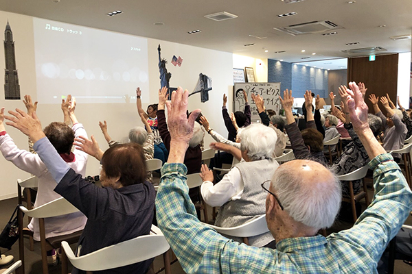 この日はニューヨークフェアということで、普段ご利用されるデイルームをニューヨーク仕様に飾り付けをして皆様をお迎えしました♪